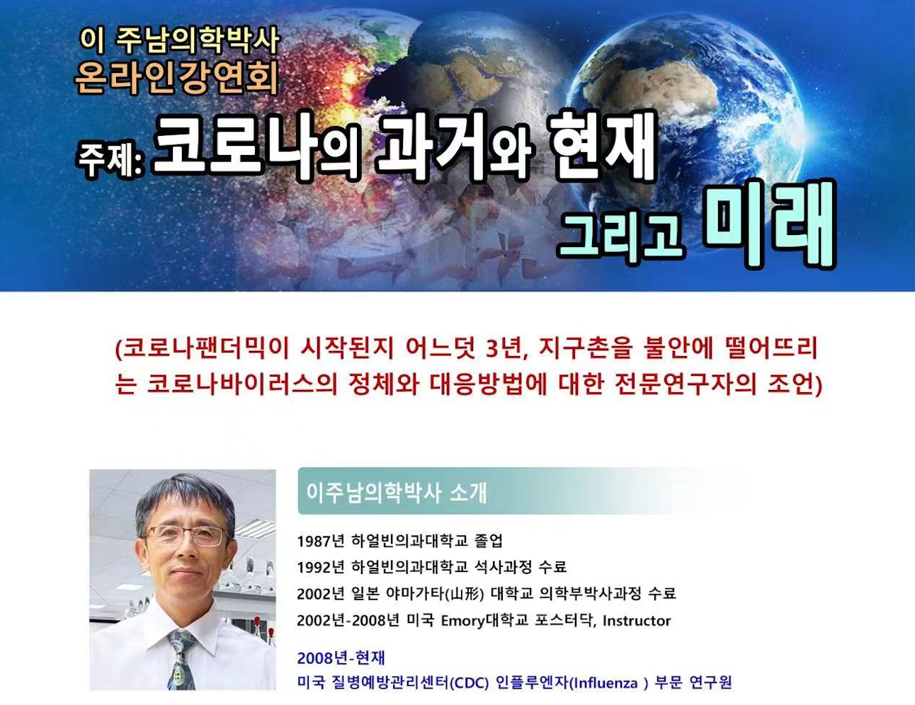 강사는 미국 국가질병예방관리센터(CDC) 인플루엔자부문에서 연구원으로 근무하는 조선족학자 李柱男박사님이시고, 강연주제는 “코로나의 과거와 현재 그리고 미래” 입니다.